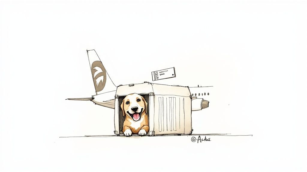 Regardless of which option you choose, the right carrier is key—it's your dog's personal space for the entire flight. For those flying in the cabin, a soft-sided carrier is usually best. If you need more guidance, you can check out our deep dive on selecting the right airline travel pet carrier.
